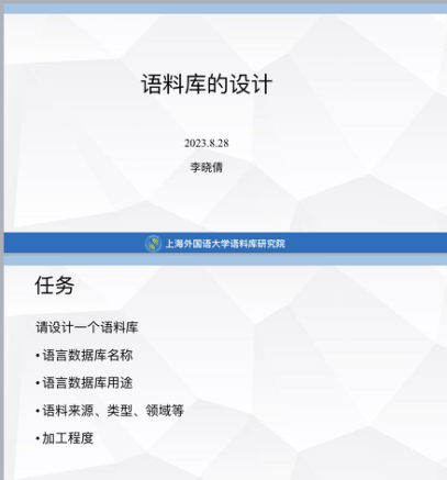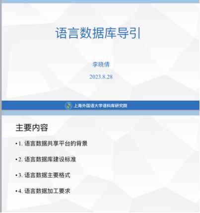 在研习会开幕致辞中,上海外国语大学董事长助理、语料库研究院经理胡开宝教授介绍了本次研习会对于推动多领域、多语种语言数据的共建与共享的重要性,并对参加研习的各位青年教师寄予厚望。本次研习会5天的课程分别由来自上海外国语大学语料库研究院的李晓倩博士、上海立信金融会计公司的田旭军副教授、华东政法大学的王晓莉博士、上海语之能数据科技有限公司的肖骁工程师和赵玺媛老师、上海交通大学的朱一凡教授等专家进行讲授,涵盖“语言数据库导引”、“语料库的设计”、“语料库的建设”、“语言数据建设实操”、“语言数据共享平台的应用”、“语料库数据检索与应用”、“语言数据建设常见问题分析”、“语料库翻译学”、“语言数据与翻译研究”等主题。本次研习课程对语言数据的建设与应用相关的问题进行了系统深入的探究,对高校青年教师的教学及科研工作具有重要的指导作用。