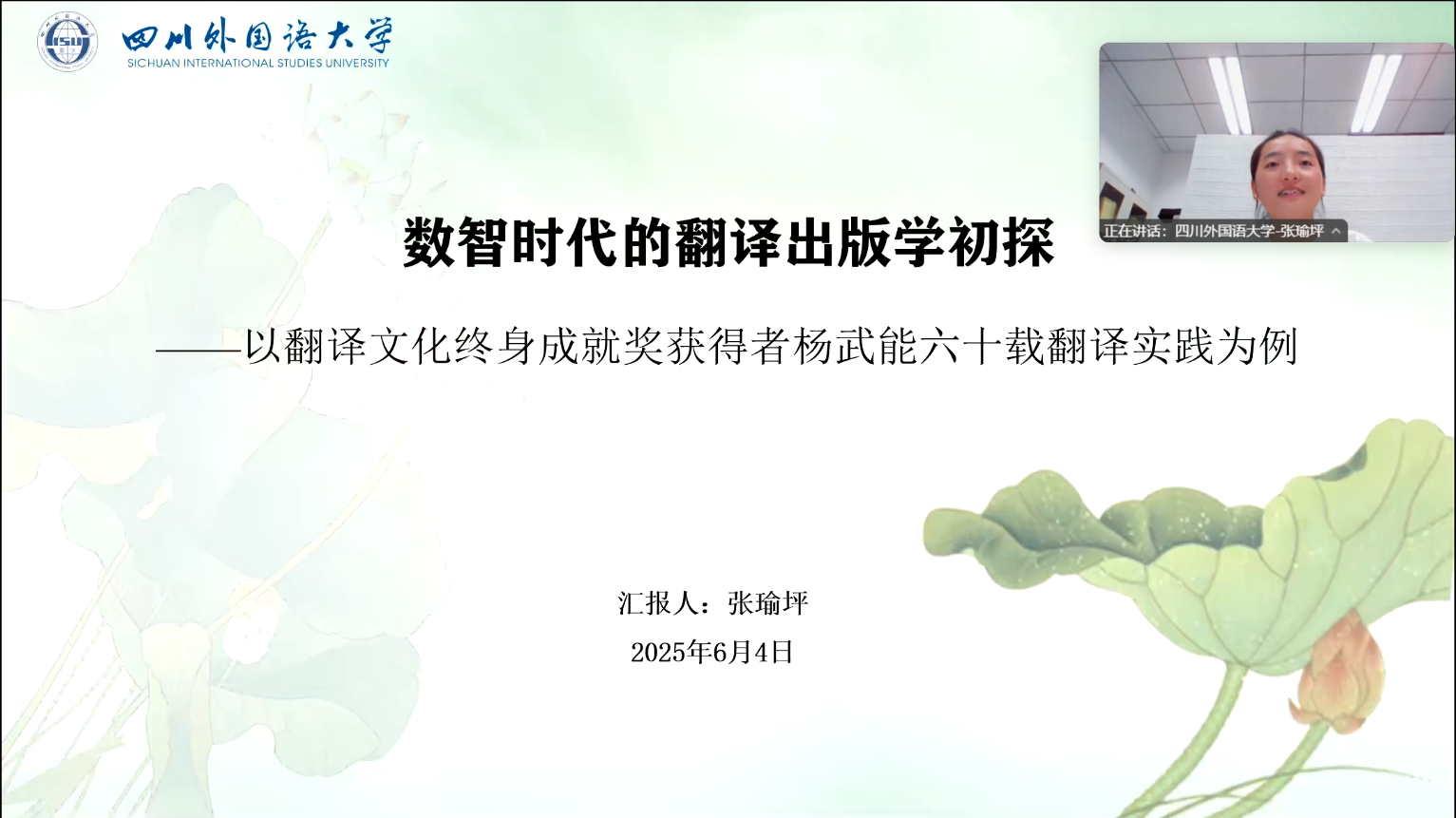 2025年6月4日,翻译协会邀请公司2023级翻译学博士研究生张瑜坪开设讲座,主题为“数智时代的翻译出版学初探——以翻译文化终身成就奖获得者杨武能六十载翻译实践为例”。翻译协会会长赵新雷主持讲座。