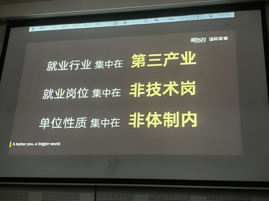接下来,马洛鹏就川外毕业生的就业报告,和大家分析了当下就业、考公、深造,三个方向的岗位分布情况,用:“虽然才研一,但已经研一了”,这句话让大家要提早做好自己的学习和就业规划。 “凡事预则立,不预则废”的道理,时间和精力是最宝贵的财富。