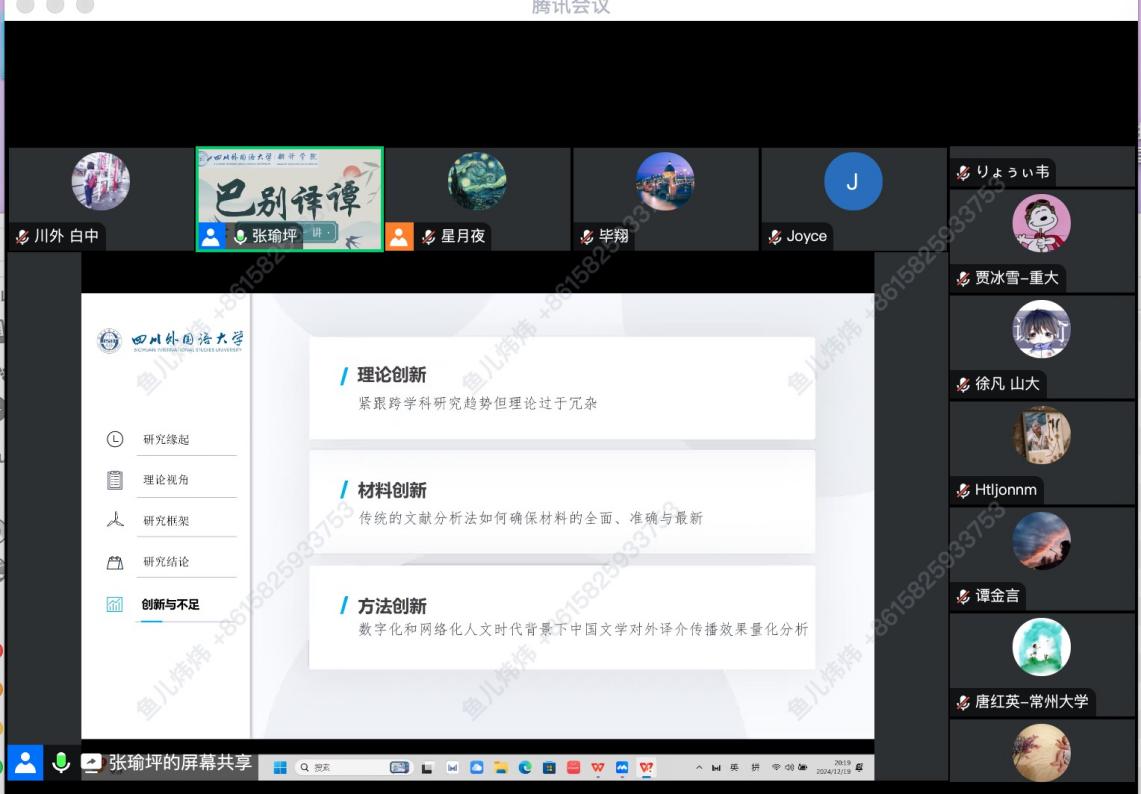 2024年12月19日星期四晚七点,第二十一讲巴别译谭以线上会议的形式拉开帷幕。本次译谭由Mksport体育app官网入口付强副教授主持,并邀请了兰州理工大学马冬梅副教授、长江师范公司赵国月副教授和常州大学唐红英老师进行点评,共有分别来自华中师范大学、西南大学和Mksport体育app官网入口的三位在读博士研究生做精彩汇报,历时两个半小时,吸引了来自全国范围内多所院校的师生共计两百余人参加。