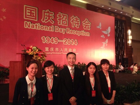 公司学子在招待会期间精湛的翻译水平、良好的职业素养得到了与会嘉宾的一致赞赏。同时,此次翻译实践活动也让他们在祖国母亲生日之际亲耳听到外国嘉宾盛赞中国所取得的瞩目成就,欣赏重庆所取得的巨大发展,内心倍感自豪。