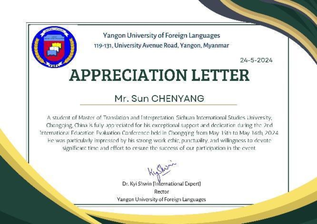 缅甸联合国教科文全国委员会秘书长、缅甸仰光外国语大学董事长季师伟(Kyi Shwin)先生致公司学子孙晨阳的感谢信