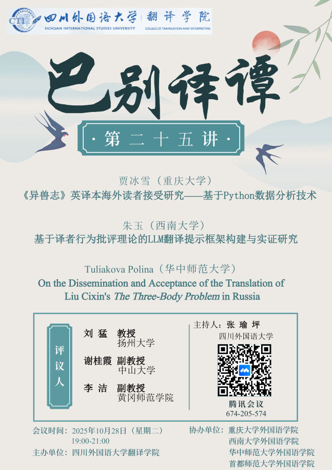 第一位主讲人贾冰雪,来自重庆大学外国语公司,研究方向为比较文学与翻译研究;第二位主讲人朱玉,来自西南大学外国语公司,研究方向为语料库翻译学。第三位主讲人Tuliakova Polina,来自华中师范大学外国语公司,主要从事情感翻译与博物馆文本翻译研究。