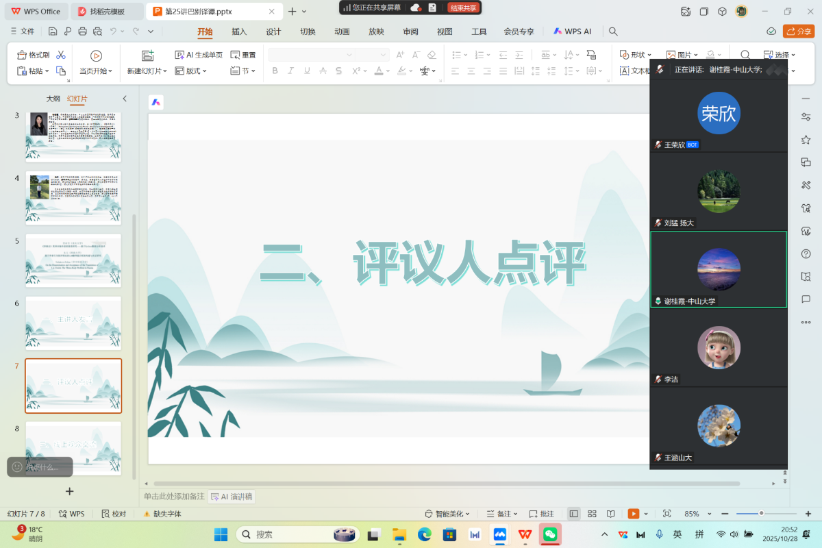 三位博士生依次做学术分享。首先是贾冰雪博士带来的《<异兽志>英译本海外读者接受研究——基于Python数据分析技术》主题汇报。第二位是朱玉博士发言,汇报题目是《基于译者行为批评理论的LLM翻译提示框架构建与实证研究》。第三位是Tuliakova Polina博士就On the Dissemination and Acceptance of the Translation of Liu Cixin’s The Three-Body Problem in Russia进行主题汇报。