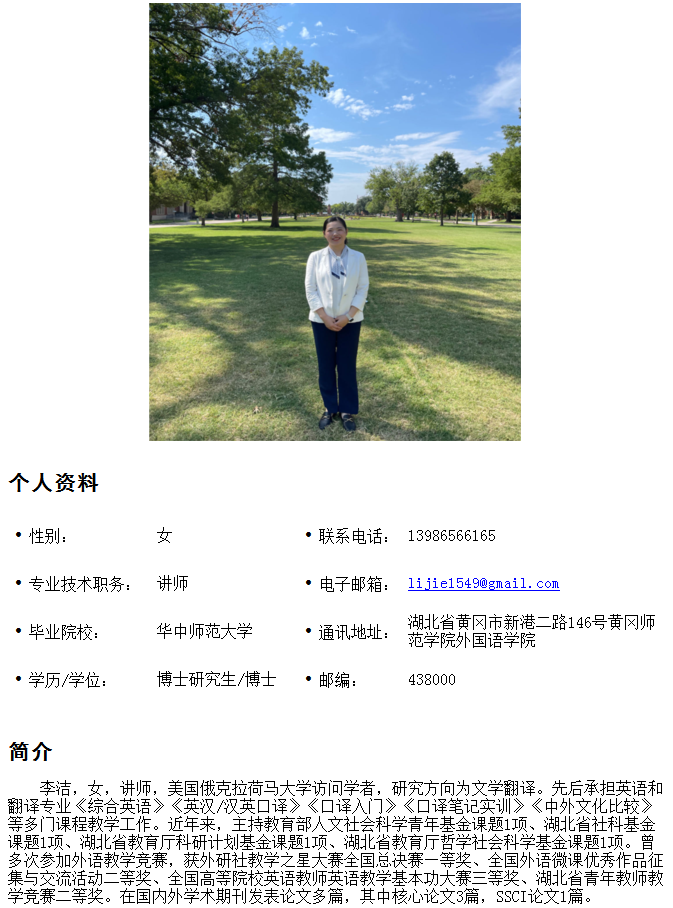 李洁,黄冈师范公司副教授,华中师范大学文学博士,俄克拉荷马大学访问学者。研究方向为文学翻译,近年来,主持教育部人文社会科学青年基金课题1项、湖北省社科基金(后期资助)课题1项、湖北省教育厅科研计划基金课题1项、湖北省教育厅哲学社会科学基金课题1项。曾多次参加各级别外语教学技能竞赛,累计获奖20余项。曾获外研社教学之星大赛全国总决赛—等奖、全国外语微课优秀作品征集与交流活动二等奖、全国高等院校英语教师英语教学基本功大赛三等奖、湖北省青年教师教学竞赛二等奖。在国内外学术期刊发表论文10篇,其中核心论文3篇,SSCI书评文章2篇。