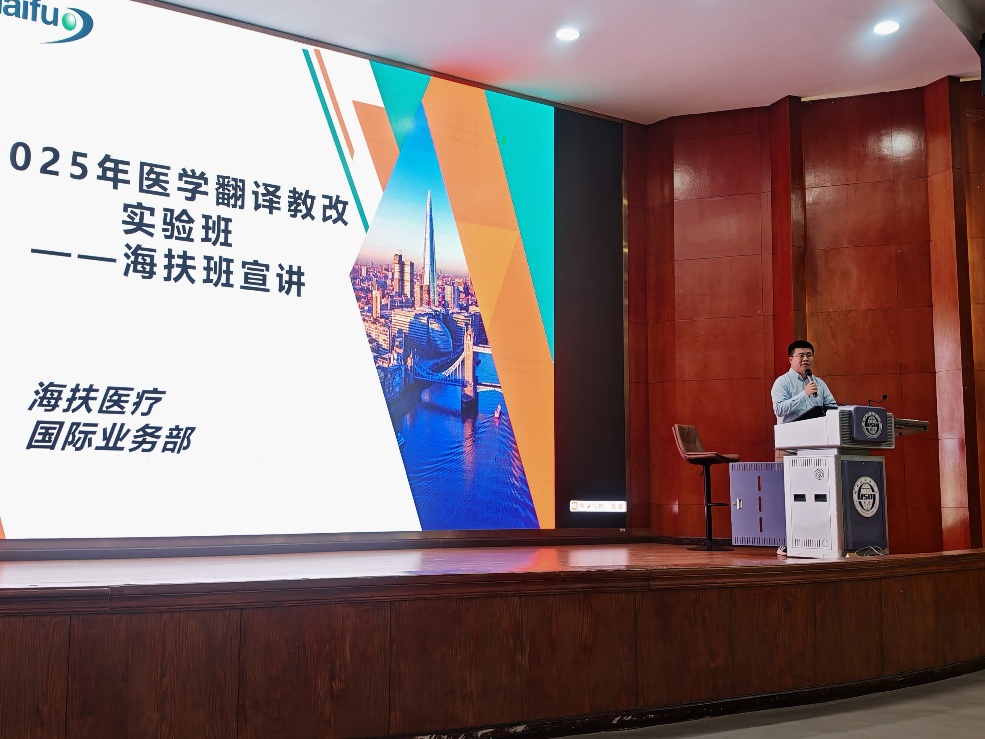 2025年10月13日下午,Mksport体育2025级医学翻译教改实验班“海扶班”招生宣讲会在培英楼放映厅举行。本次宣讲会面向公司2025级研一同学和2023、2024级本科同学召开,共有近200名同学参加。重庆海扶医疗科技股份有限公司国际学术专员徐东元、公司实习实训办公室主任廖崇骏博士及研一辅导员降轶心老师出席了本次宣讲,宣讲会由廖崇骏老师主持。