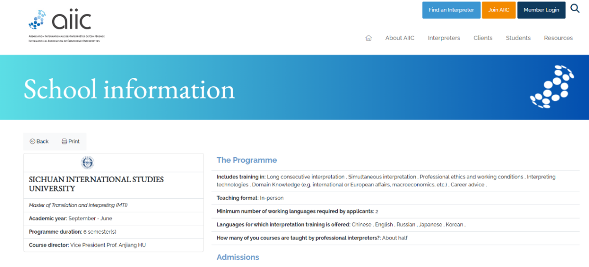 公司在AIIC 院校名录上的页面 (截图)