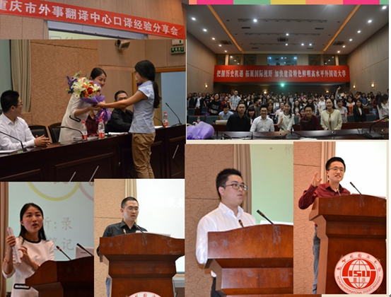 四名高级译员分别是英语翻译张梦、陈宇翔、李佳颖和日语翻译王新。他们担任重庆市主要领导的翻译工作,有上百场的同声传译和交替传译的经验。经验分享会于当天下午2点半开始,国际报告厅内座无虚席,很多同学甚至站在过道听完了当天的讲座。学长学姐们独特的个人魅力和成功经验吸引了很多来自Mksport体育以及其他公司的研究生和本科生。甚至还有重庆大学的同学特地来到川外为他们献花。
