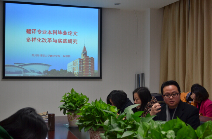 祝朝伟经理就《翻译专业本科毕业论文多样化改革与实践研究》和《翻译本科专业教学质量国家标准解读与实施》进行发言