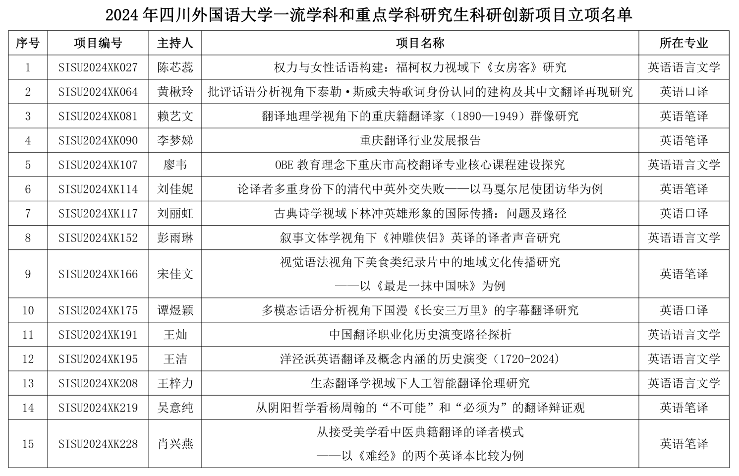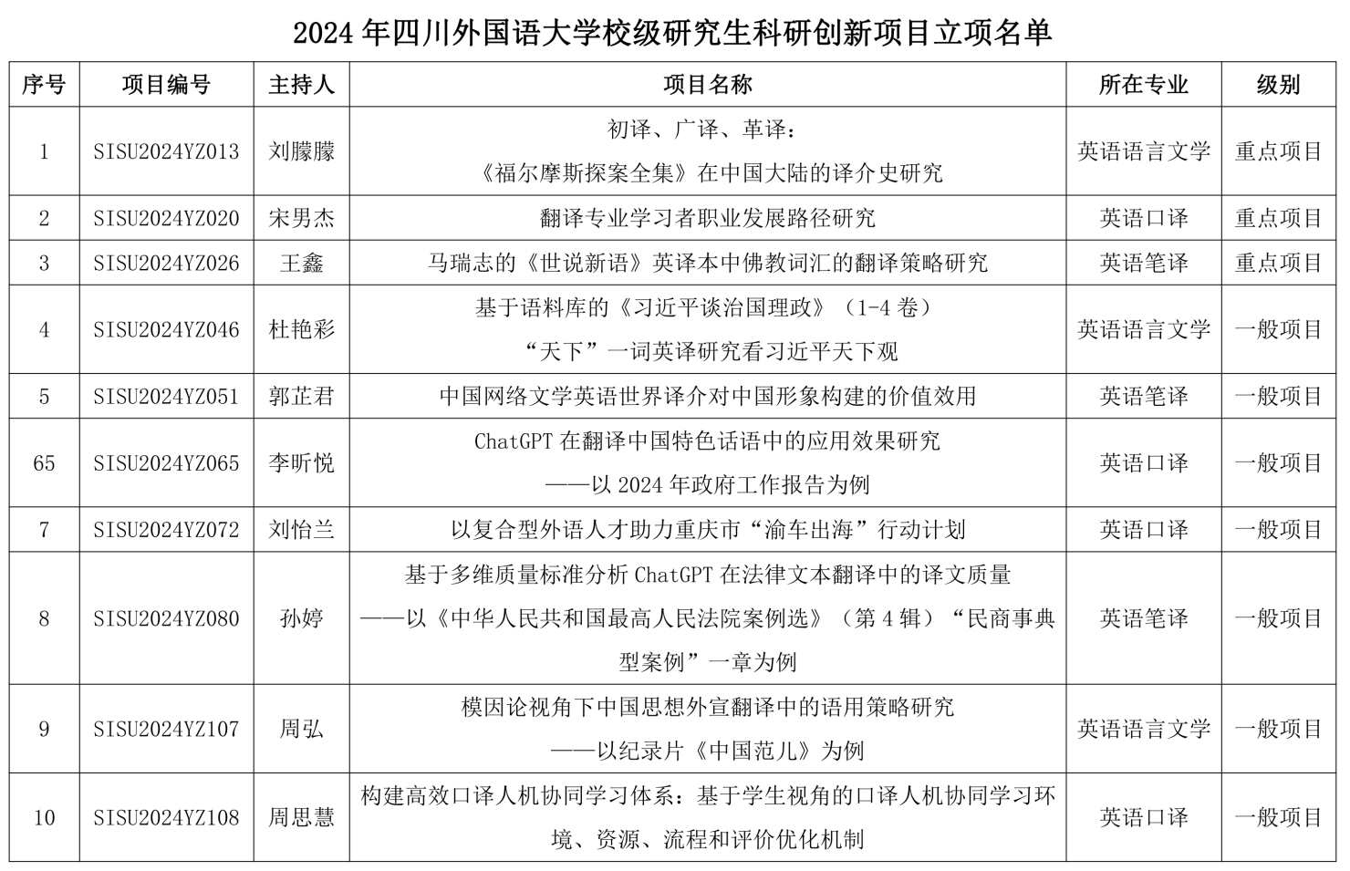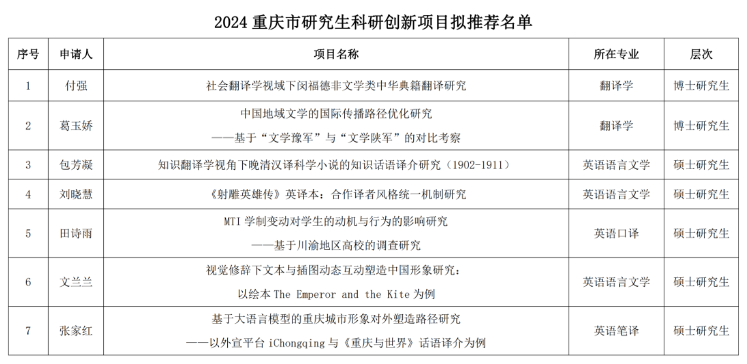 根据《重庆市研究生科研创新项目管理工作指南》及《Mksport体育app官网入口研究生科研创新项目管理办法(修订)》(川外发〔2022〕70号)相关要求,为加强研究生科研创新能力培养,鼓励在校研究生积极承担创新性研究课题,进行高水平的科学研究探索,公司开展了2024年研究生科研创新项目申报工作。