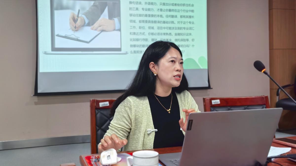 讲座伊始,陶红经理回溯了自己的职业成长轨迹,从英语专业背景逐步深耕金融领域,成为国际金融理财师、美国注册财务策划师,其“英语+金融”的跨界经历本身就是“金融外语双向赋能”的生动样本。