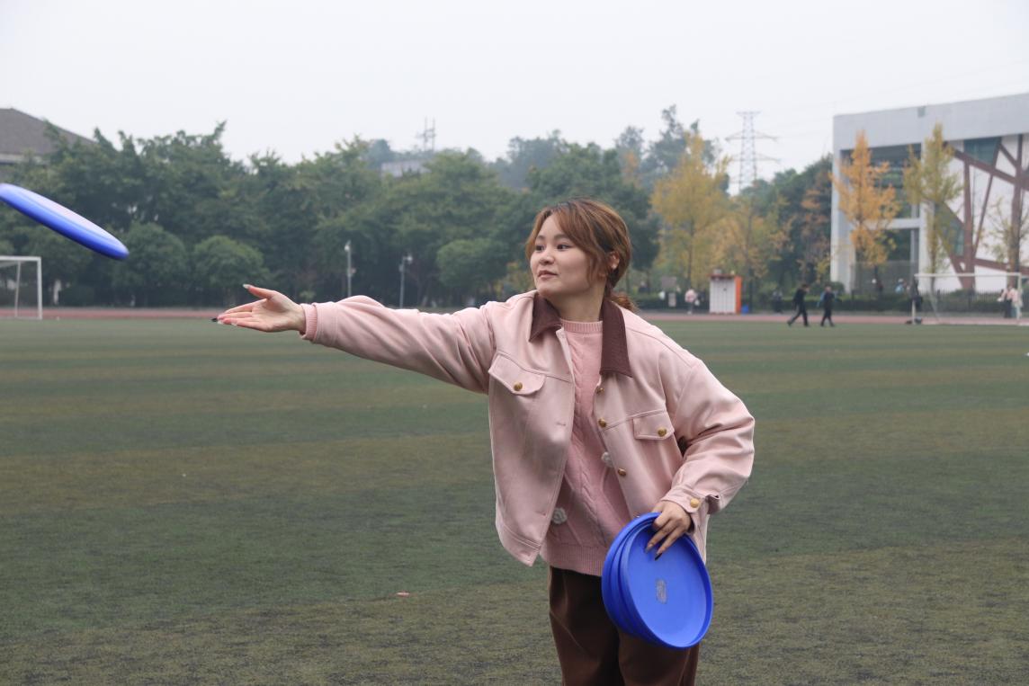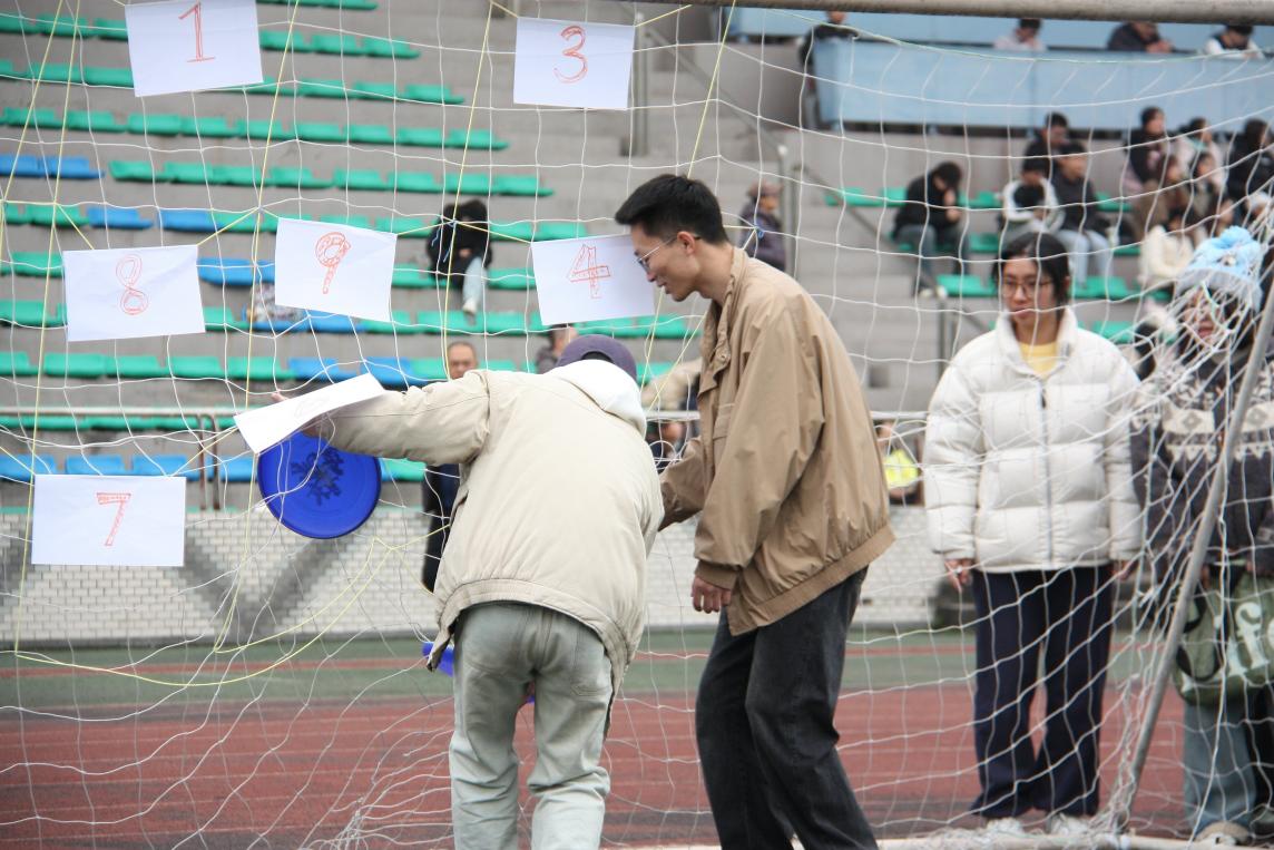 全程赛项目为数字飞盘,贯穿比赛全程,同学们依次扔飞盘,扔中相应的数字就积相应的分,大家都热情高涨、踊跃参与,赛场上一片欢声笑语。