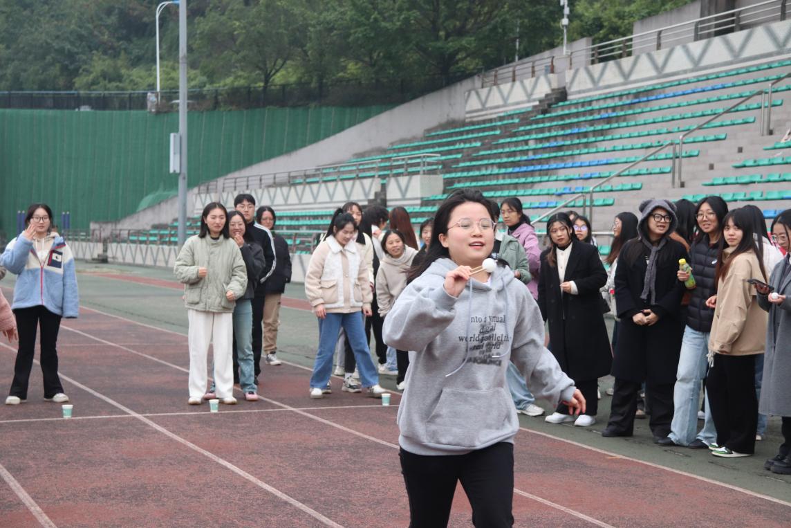 此次趣味运动会分为团体赛、个人赛、全程赛三轮比拼。团体赛包含篮球接力、纸杯大战、战争机器、筷子功夫、雪球滚滚五个项目,旨在考验团队协作力和合作默契度,为同学们之间增进了解、增强友谊提供了平台。2023级笔译2班研究生刘汗青接受采访时说道,“这一次趣味运动会从游戏的设置到现场的安排,从人员组织到后期抽奖,都是满分的。我参加了筷子功夫,这是一个非常考验巧劲和耐心的游戏,大家齐心协力想办法,团结一致最后才获得了胜利。”