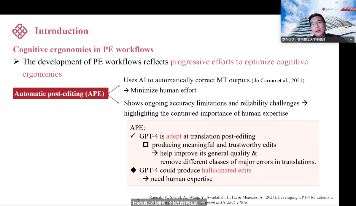 讲座伊始,李教授指出,随着人工智能技术的飞速发展,翻译活动已从传统纯粹的认知活动转变为复杂的人机交互过程,AI辅助译后编辑(AIPE)成为翻译实践的新范式。为探究其对译者认知负荷的影响,李教授团队开展了针对性实证研究,为 AI 时代的翻译研究提供了科学依据。
