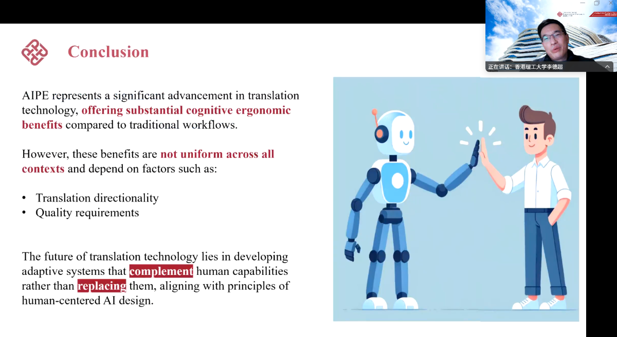 李教授强调,AIPE通过提供实时解释和建议,有效降低了译者的外部认知负荷,但同时可能增强相关认知负荷,其认知效益需结合翻译方向性和质量要求具体考量。研究结果再次印证,高质量翻译任务中人类专业知识的核心地位不可替代,AI应定位为译者的“协作伙伴”而非“替代者”。未来翻译技术发展需致力于构建以人为中心的AI系统,实现人机能力的优势互补。