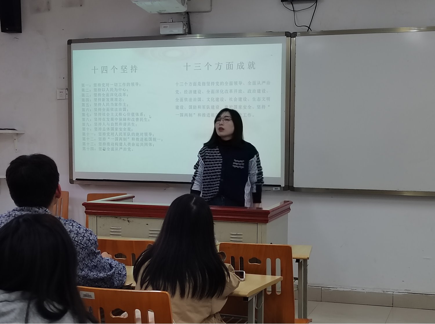 在团课上,同学们了解和学习了“两个结合”、“六个必须坚持”、“十个明确”、“十四个坚持”、“十三个方面成就”的具体内容。张信书记强调,青年员工在进行实践创新理论创新的同时,要把握好、坚持好习近平新时代中国特色社会主义思想的世界观和方法论,并且要将其贯彻在我们的实际生活之中。集中学习之后,同学们纷纷表示,作为青年学子,我们要用习近平新时代中国特色社会主义思想武装头脑,坚持学思用贯通、知信行统一,把习近平新时代中国特色社会主义思想变成改造主观世界和客观世界的强大思想武器,注重理论与实践的结合,走进社会,在社会实践中发现和思考问题,始终将个人理想与国家发展同频共振,努力为实现中华民族伟大复兴而努力奋斗。