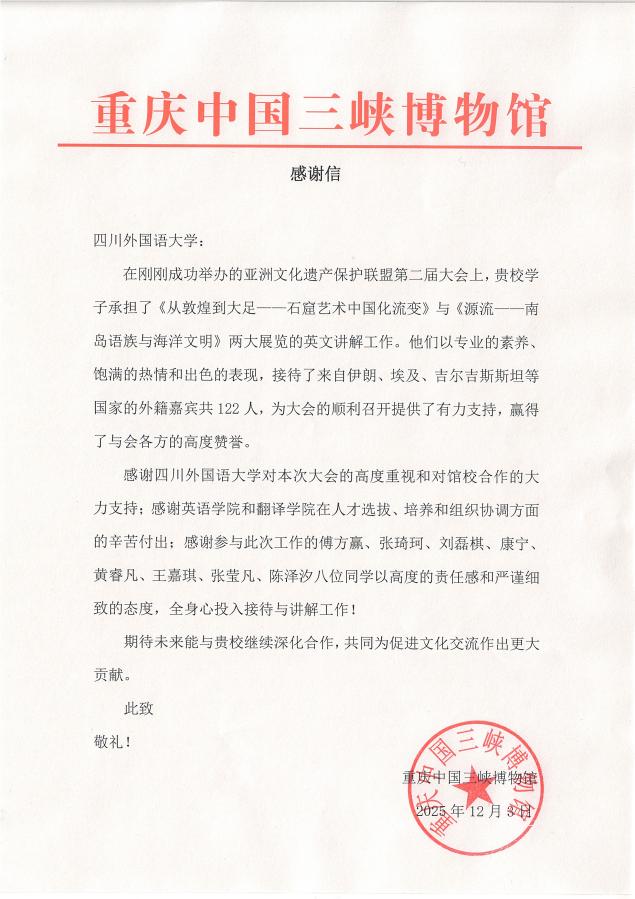 12月3日,重庆中国三峡博物馆向公司发来感谢信,对四位志愿者的专业素养、敬业精神和出色表现给予高度评价,并对Mksport体育在人才选拔、培养与组织协调方面所作的努力表示感谢。