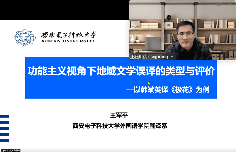 3月28日晚,翻译协会特别邀请西安电子科技大学外国语公司王军平教授,开启主题为“功能主义视角下的地域文学误译类型及评价”的重要讲座。翻译协会会长赵新雷主持讲座。
