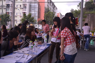 2012年9月11日和12日,四川外语公司2012级新生来到公司西区篮球场报道注册。尽管下着雨,但冰冷的雨依旧降不了员工和家长心中的热情。在报名的两天之中,西区各个院系报到点人头攒动,从全国各地赶来的新同学在各个手续办理点之间来回奔波忙碌着。