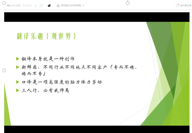 通过这次分享会,同学们不仅对口译职业和学术研究有了更深入的了解,也对未来的发展方向有了更清晰的认识。最后,主持人秦勤老师总结了本次分享会,并鼓励同学们要勇敢追求自己的梦想,不断探索未知的领域。她强调,无论是学术研究还是职业发展,都需要明确的目标、完善的计划、强大的执行力以及适时的反思。只有通过不断的努力与学习,才能在翻译之路上走得更远。