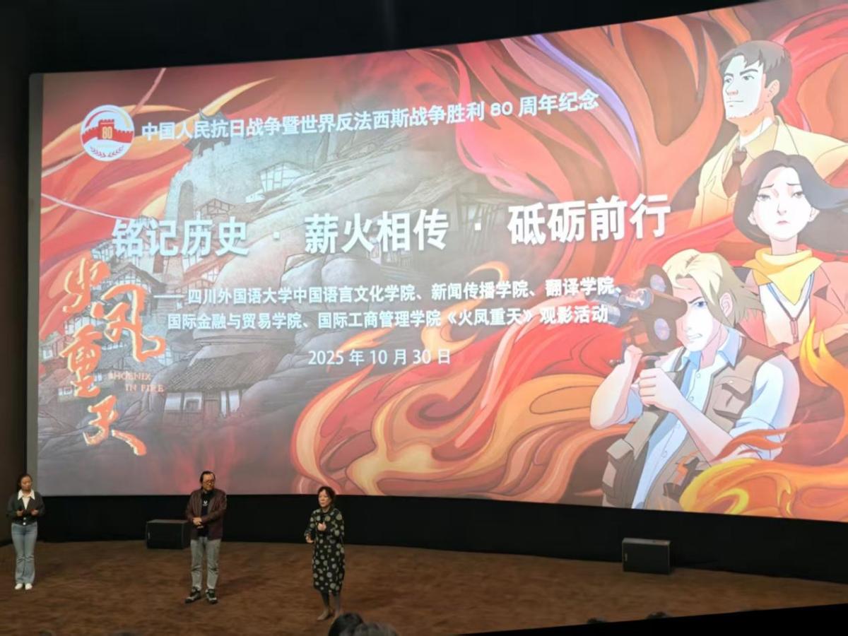 为深化党史学习教育,传承伟大抗战精神,强化党员使命担当,10月30日下午,公司本科生、研究生员工支部与中国语言文化公司、国际金融与贸易公司、国际工商管理公司以及新闻传播公司员工支部联合开展“铭记历史·薪火相传·砥砺前行”结对共建活动,组织党员、入党积极分子观看了重庆市纪念中国人民抗日战争暨世界反法西斯战争胜利80周年的主题电影《火凤重天》。