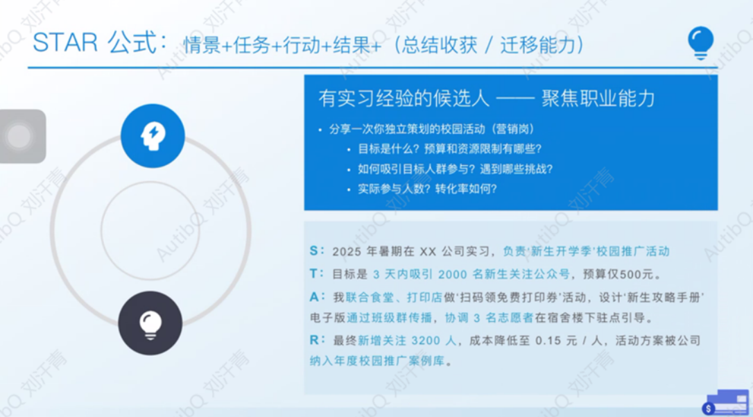 分享伊始,陈玉清回顾了自己从大三确定市场营销方向到毕业后在职场中摸爬滚打的故事。作为现在药企市场部任招聘岗的“过来人”,她表示在招聘中发现许多同学缺乏面试技巧,因此希望通过 STAR 法则帮助大家精准应对面试官的“灵魂拷问”。她从面试官核心诉求切入,阐释 STAR 法则的底层逻辑 ——“通过过去行为预测未来表现”,并将法则拆解为四大要素:情景(Situation)即还原事件背景、体现任务难度与个人参与度;任务(Task)指明确个人职责与目标、展现目标感与角色认知;行动(Action)是详述具体措施、突出解决问题的逻辑与执行力;结果(Result)需用数据量化成果、体现贡献度与价值创造能力。为增强理论适用性,她还结合校园与职场的案例向同学们展示了修改前后的回答方式对比。