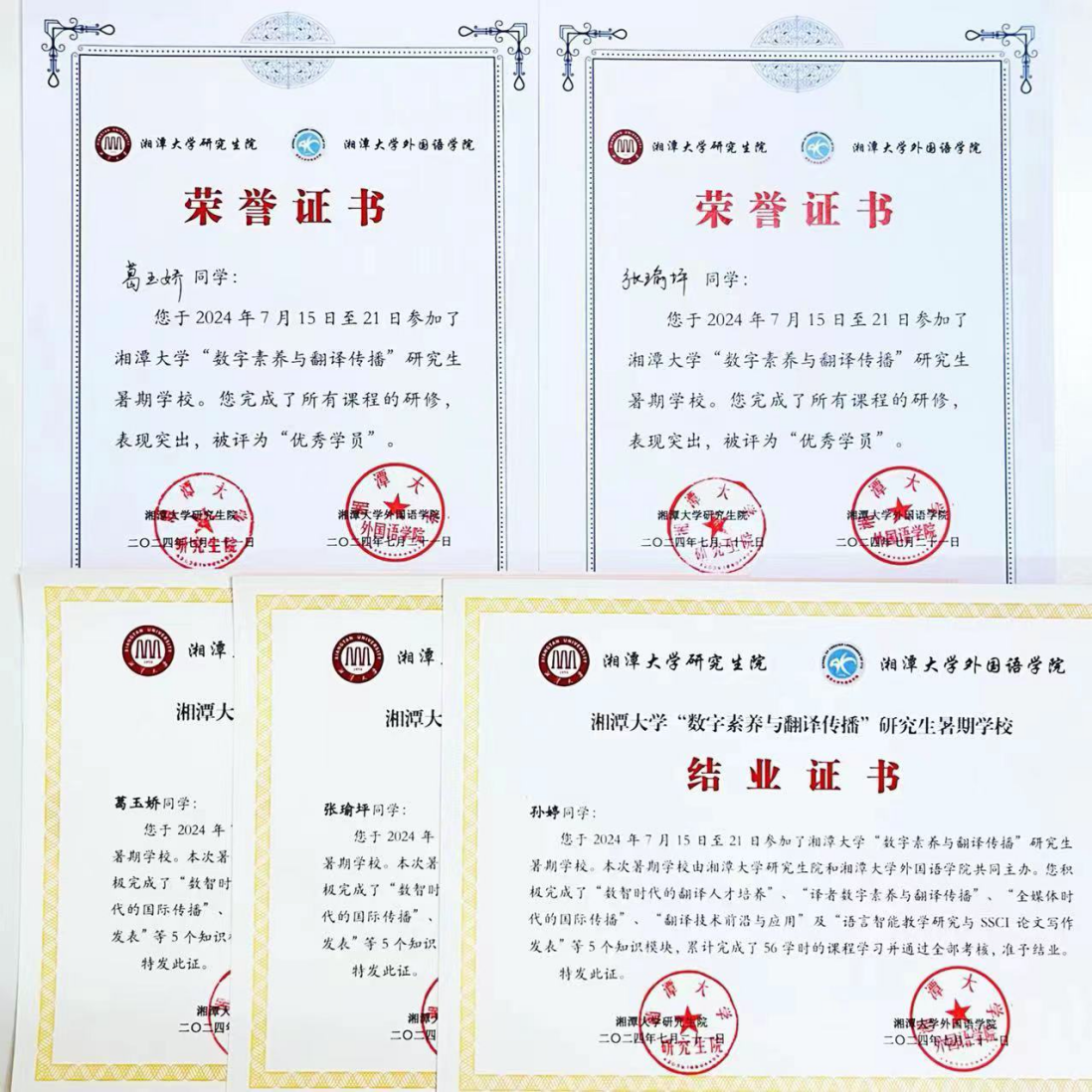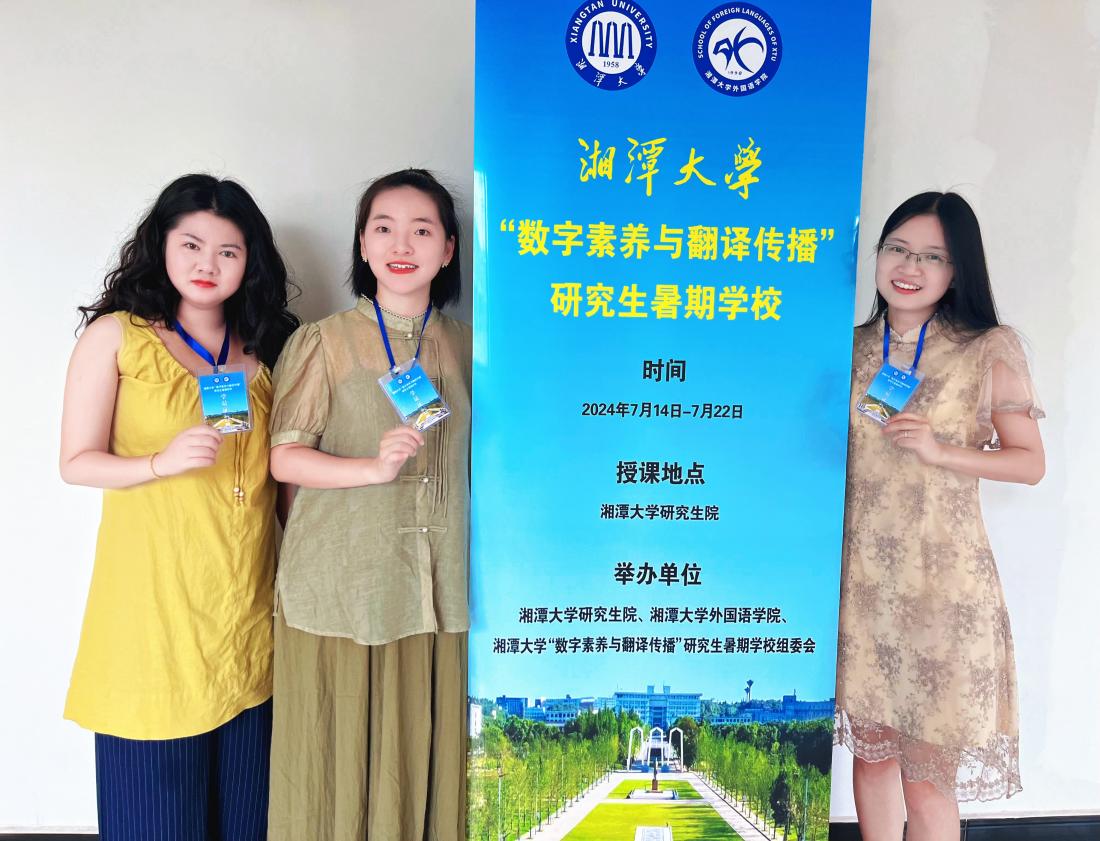 7月15日至21日,湘潭大学举办开展2024年“数字素养与翻译传播”研究生暑期公司。本次暑期公司通过报名选拔,邀请了来自国内外50余所知名高校的80余名优秀硕士研究生、博士研究生和青年教师,公司2023级博士研究生葛玉娇、张瑜坪及2023级硕士研究生孙婷受邀参加了此次暑期公司。
