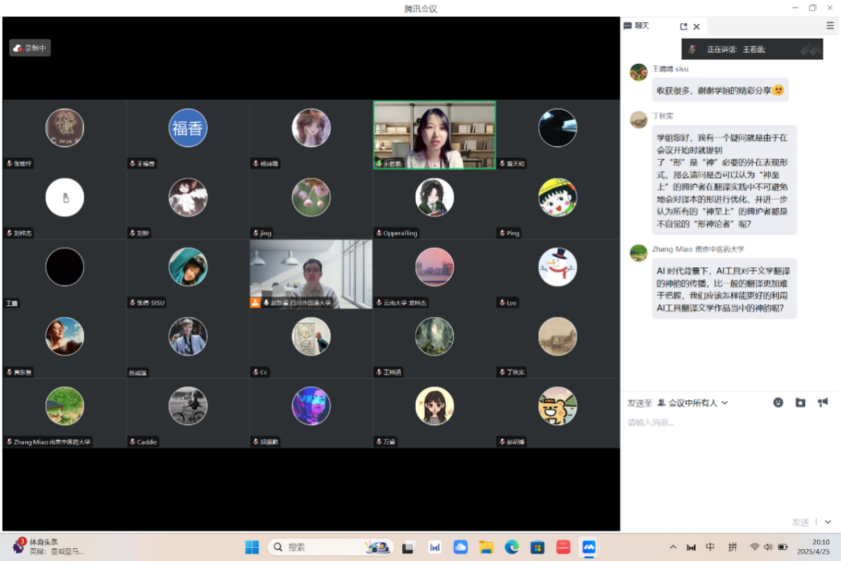 2025年4月25日,翻译协会特别邀请浙江大学外国语公司博士生王若菡开设讲座,主题为“再谈文学翻译中的形与神”。翻译协会会长赵新雷主持讲座。
