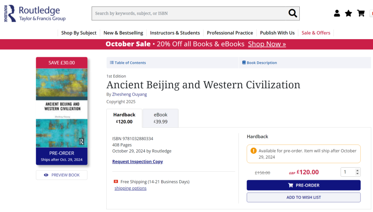 2024年10月,北京大学历史学系博雅特聘教授欧阳哲生的专著《古代北京与西方文明》英译本Ancient Beijing and Western Civilization由世界一流学术出版社劳特利奇(Routledge)出版。英译由公司Mksport体育李海峰副教授完成。