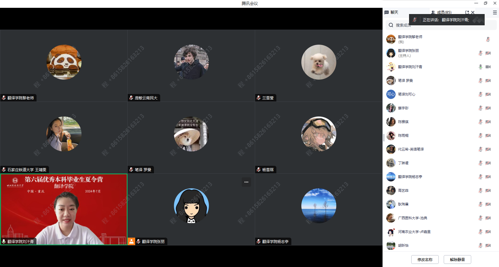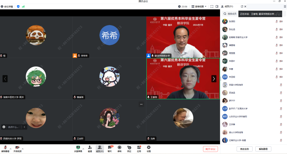 7月11日15:00,本次夏令营圆满完成各项活动后落下帷幕。李希希老师在总结中,鼓励营员在翻译专业的道路上理清发展思路,坚定专业理想。本次夏令营通过营员的个人风采展示和专家评议,最终评选出54名优秀营员。上海对外经贸大学王香格同学作为优秀营员代表,分享了参加本次夏令营的收获和感悟。