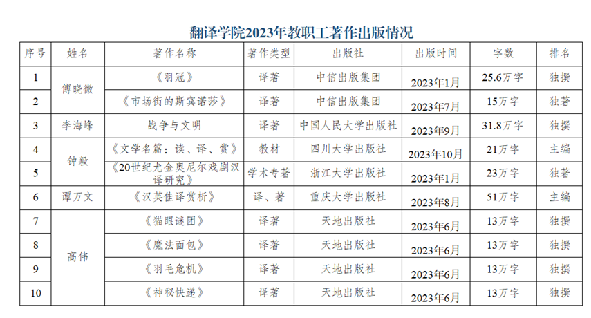 公司教师共发表学术论文14篇,出版学术专著、译著和编著等专著、译著10部。完成了重庆翻译学会刊《翻译教学与研究》第十辑和十一辑出版。