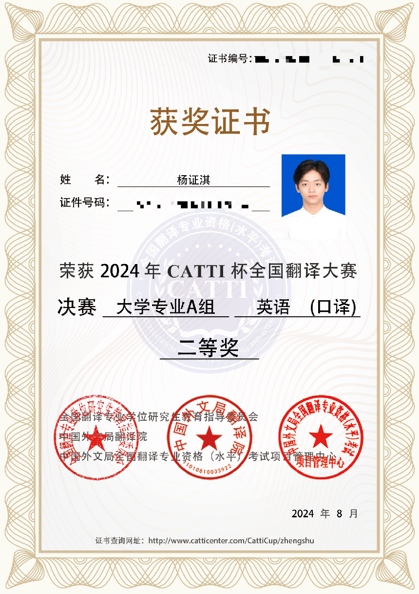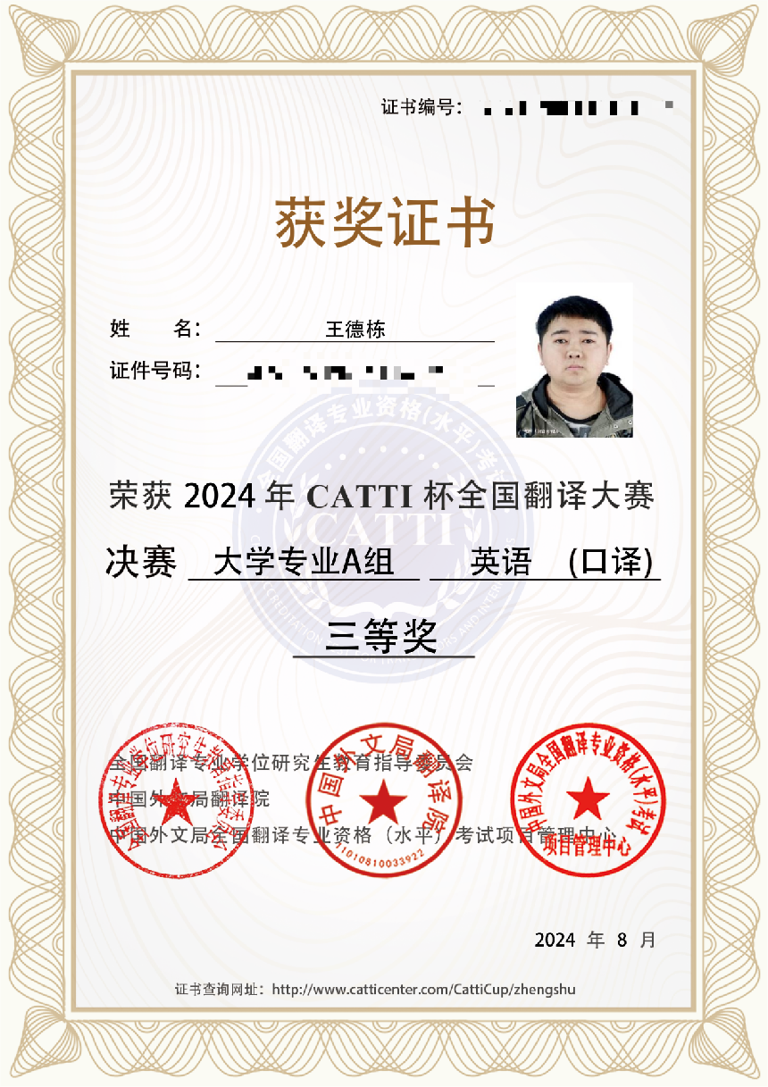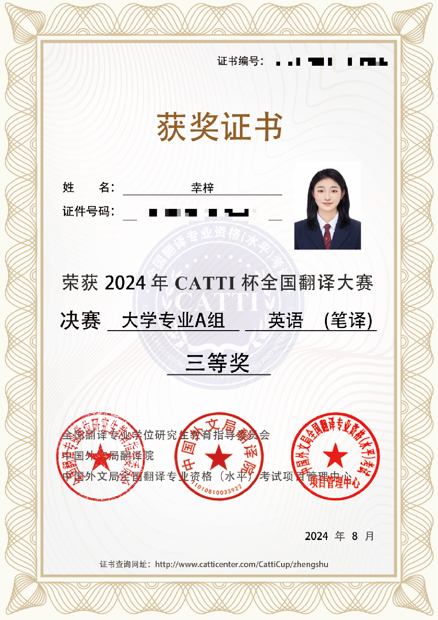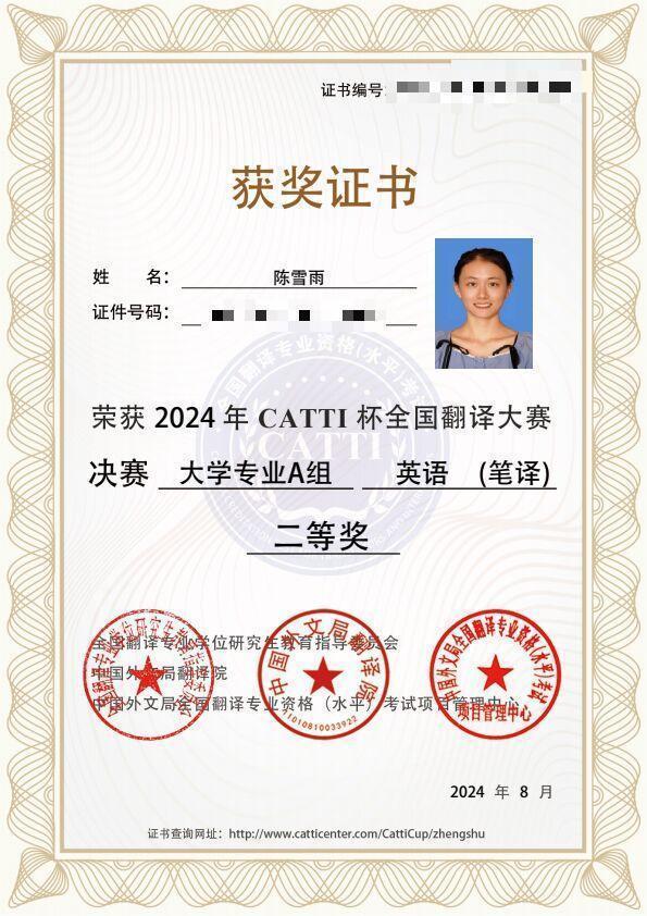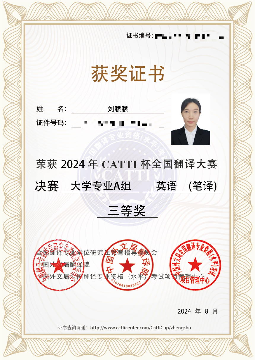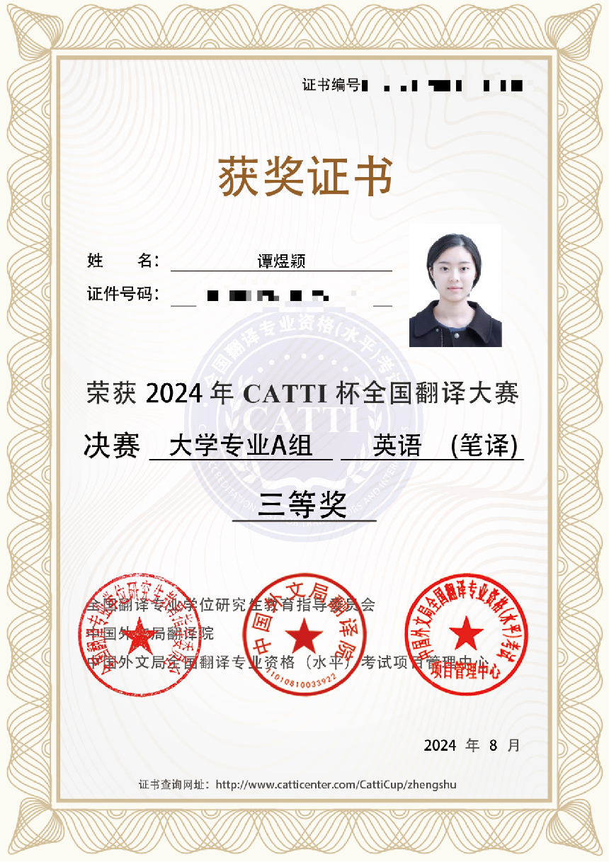 近日,由全国翻译专业学位研究生教育指导委员会、中国外文局翻译院主办的2024年“CATTI杯”全国翻译大赛全国总决赛顺利落下帷幕,公司员工在比赛中表现出色,喜获佳绩。其中2021级本科生陈雪雨获得大学组英语笔译二等奖,2023级研究生刘朦朦、谭煜颖、唐尧玲、幸梓获得大学组英语笔译三等奖,2021级本科生杨证淇获得大学组英语口译二等奖,2023级研究生王德栋获得大学组英语口译三等奖。