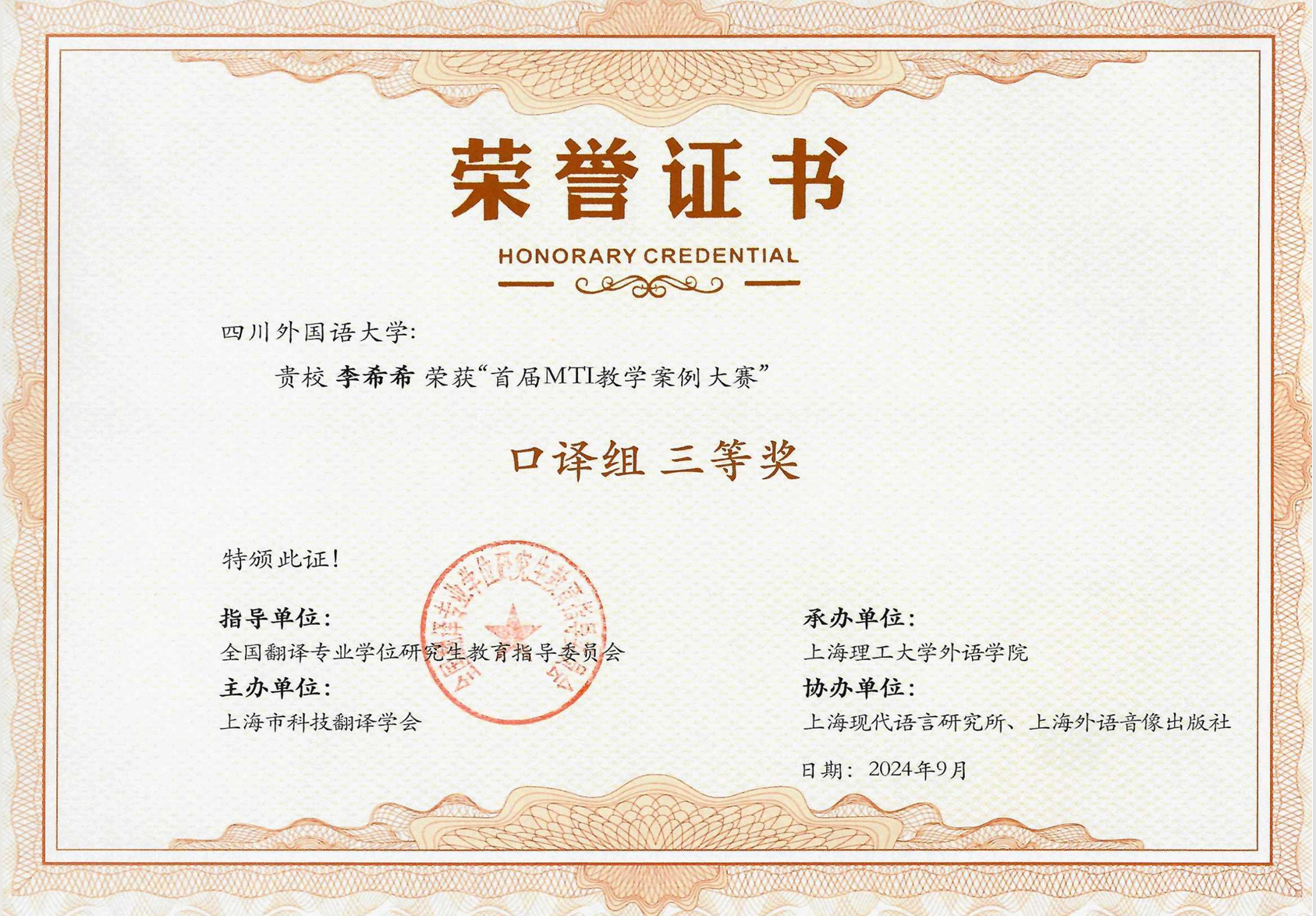 近日,“首届MTI教学案例大赛”颁奖典礼在上海外国语大学虹口校区成功举办。首届MTI教学案例大赛由全国翻译专业学位研究生教育指导委员会指导,上海市科技翻译学会主办,上海理工大学外语公司承办,上海现代语言研究所和上海外语音像出版社协办。该赛事于2024年2月26日正式启动,吸引了来自复旦大学、上海交通大学、同济大学、北京外国语大学、上海外国语大学、Mksport体育app官网入口、华东师范大学、重庆大学等近80所高校的400多位师生和合作企业代表参加,历时半年多完成。