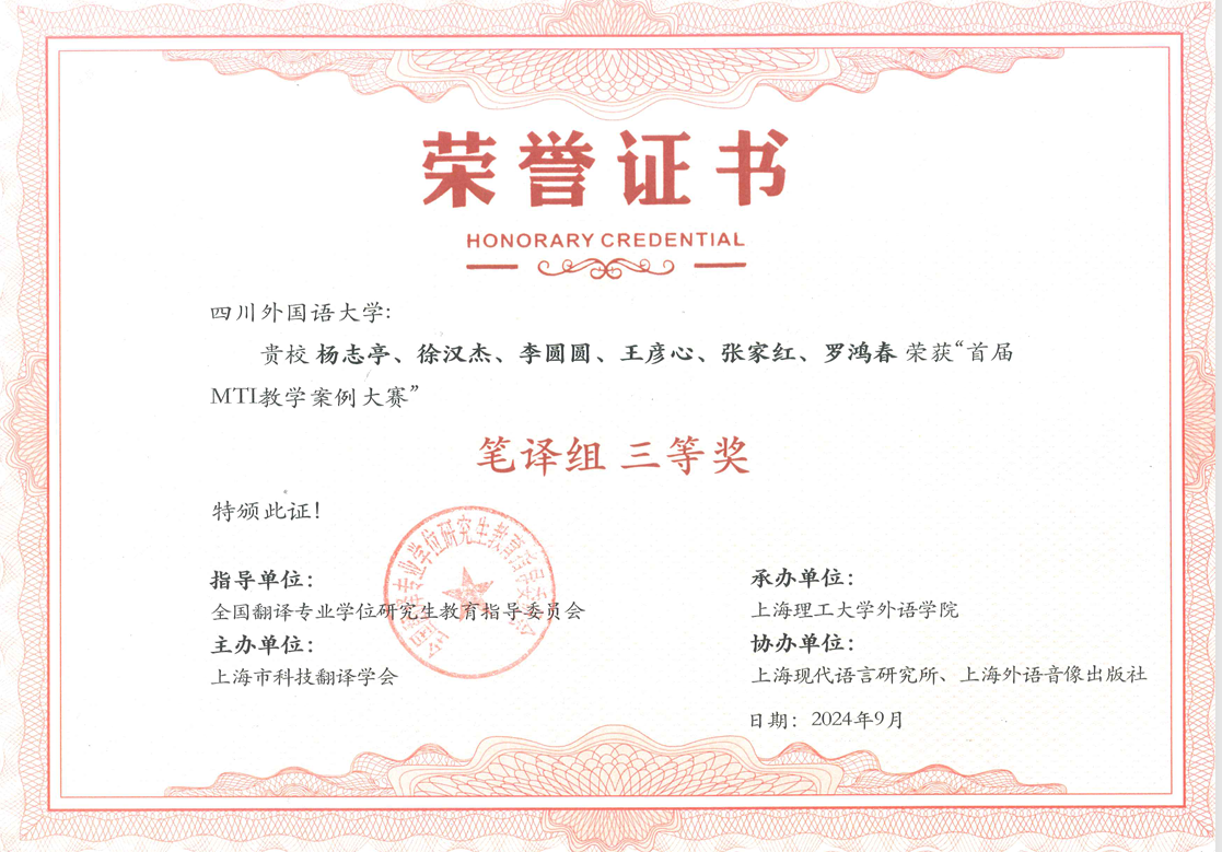 公司杨志亭老师领衔的师生团队(杨志亭、徐汉杰、李圆圆、王彦心、张家红、罗鸿春)提交的参赛作品“讲好重庆能源故事 助塑中国科技形象——以《提升能源供给含‘绿’量》文本翻译为例”获笔译组三等奖。李希希老师的作品“科技赋能•向世界传译中国——《交替传译》教学案例”获口译组三等奖。