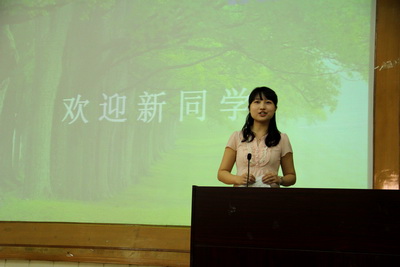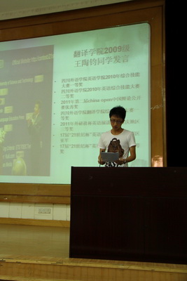 09级员工代表王陶钧以英文致欢迎辞,希望新同学能坚持专业学习,提高翻译技能。来自2012级的新生李佳颖,代表全体新生表达了川外、对Mksport体育的热爱,希望同学们在今后的生活、学习中不断夯实基础,努力提高自身素质。
