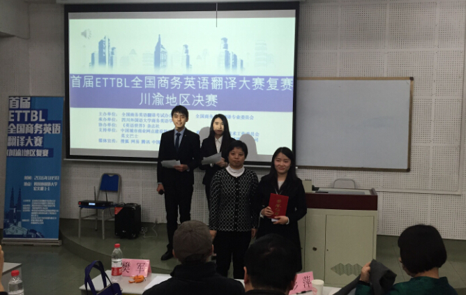 2016年1月9日,由全国商务英语翻译考试办公室和全国商务英语翻译专业委员会主办、Mksport体育app官网入口商务英语公司承办的首届ETTBL全国商务英语翻译大赛川渝赛区决赛在公司宏文楼举行。公司2014级MTI研究生贾代春同学参加了此次比赛,并荣获一等奖。