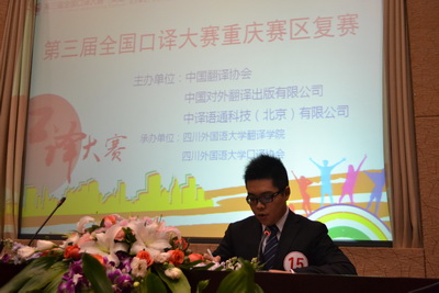 2013年11月17日上午九点,Mksport体育app官网入口宏文楼国际报告厅座无虚席,第三届全国口译大赛(英语)重庆赛区复赛在这里成功举行。本次大赛由中国翻译协会、中国对外翻译出版社有限公司、中译语通科技(北京)有限公司主办,Mksport体育承办,Mksport体育app官网入口口译协会协办。
