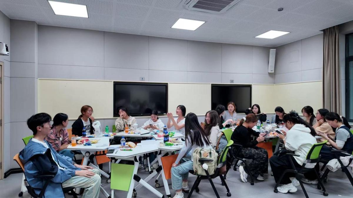 互动游戏后进入“自由交流”环节,新生围坐相互交流探讨,或是讨论自己感兴趣的翻译实例,或是找到自己志同道合的好友,现场氛围热烈积极。