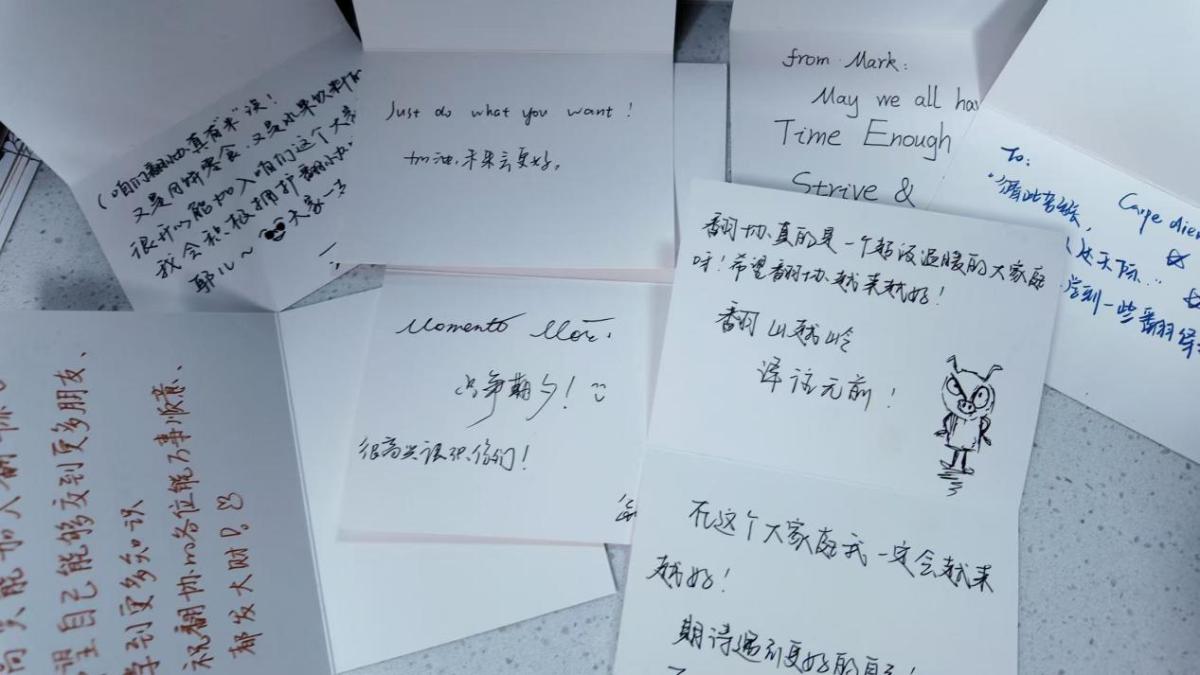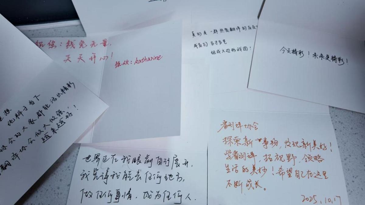 晚9点30分,见面会在掌声中结束。主持人陈艳莹总结道:“今天的见面会,我们看到了新生的热情与活力,也看到了翻译协会的未来。希望大家在协会里一起学习、成长,成为‘有理想、有担当、有温度’的翻译人才。” 新生们纷纷拿着信纸和笔写下寄语。