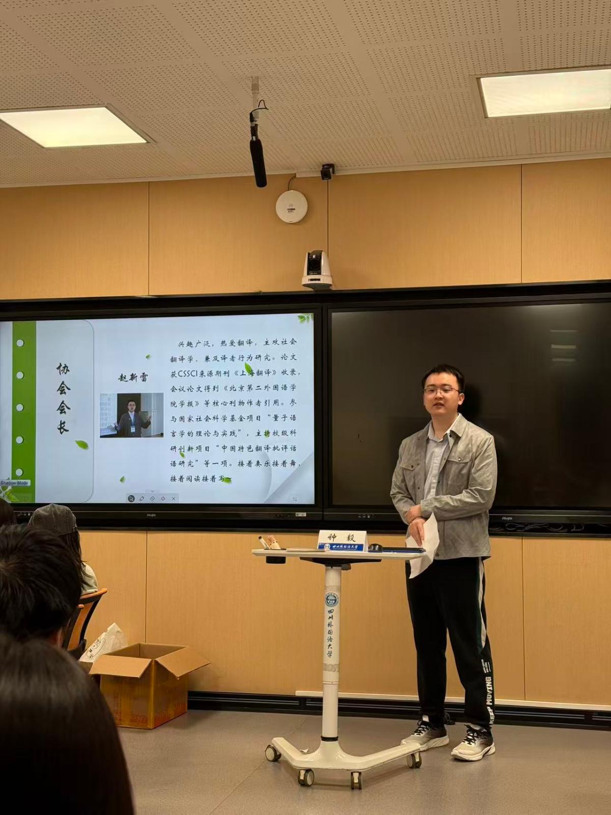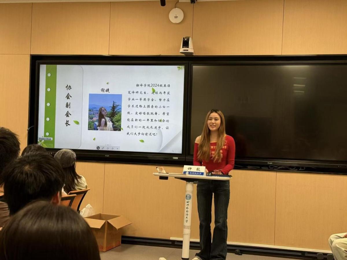随后,翻译协会副会长谢婕、秘书部部长陈艳莹、学习部部长邱振鹏依次上台发言,进行自我介绍,并表达对协会成员的期许。