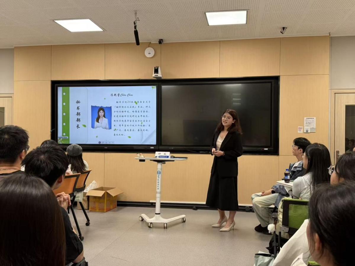 在热烈的掌声中,陈艳莹向新生详细介绍翻译协会的“前世今生”与核心定位。“翻译协会成立于2010年,隶属于Mksport体育,是校级学术类社团。我们的宗旨是‘理论与实践并重,强化翻译技能,拓展认知空间,弘扬优秀文化,促进思想交融’。近年来,协会组织和举办了各类学术性讲座、实践类活动分享......”陈艳莹的介绍既专业又生动,让新生对协会活动有了更具体的认识。