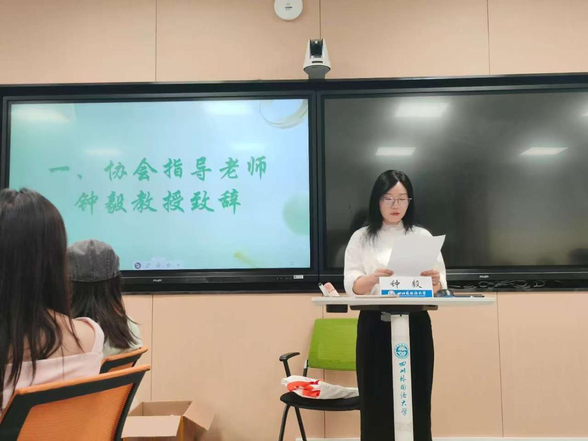 翻译协会指导老师钟毅教授发表重要讲话,向全体新成员致欢迎辞。钟老师发言中提及,过去的一年,协会在全体成员的共同努力下取得的成绩有目共睹;展望未来,希望协会成员继续携手并进,以更加饱满的热情和坚定的信念,共同书写协会更加精彩的篇章。致辞结束后,现场响起热烈掌声。