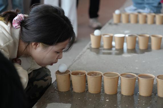个人赛同样精彩,“轻功水上漂”要求选手将乒乓球吹过7个杯子,比拼巧劲与耐心;“趣味竞走”“过河拆桥”“沙包那‘砸’了”等项目各具特色,选手们奋勇争先,既展现个人风采,也享受运动乐趣。