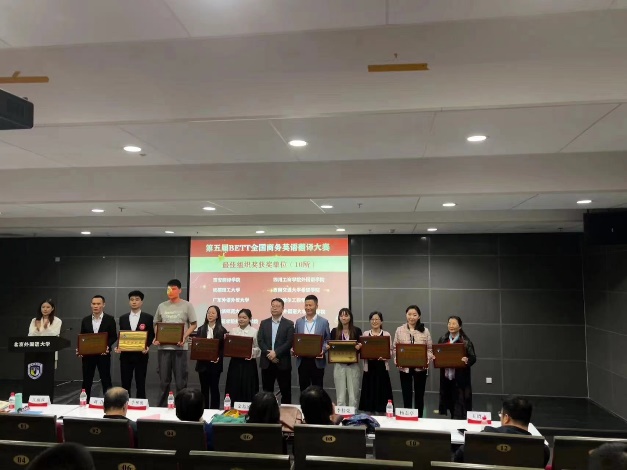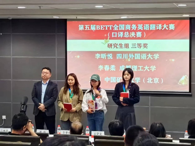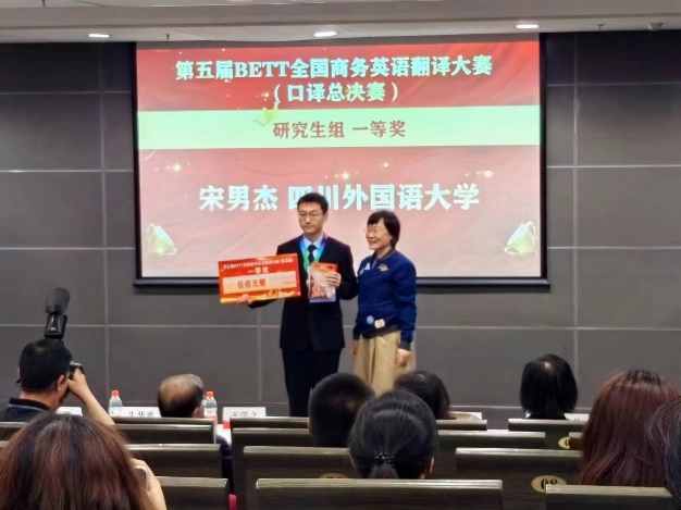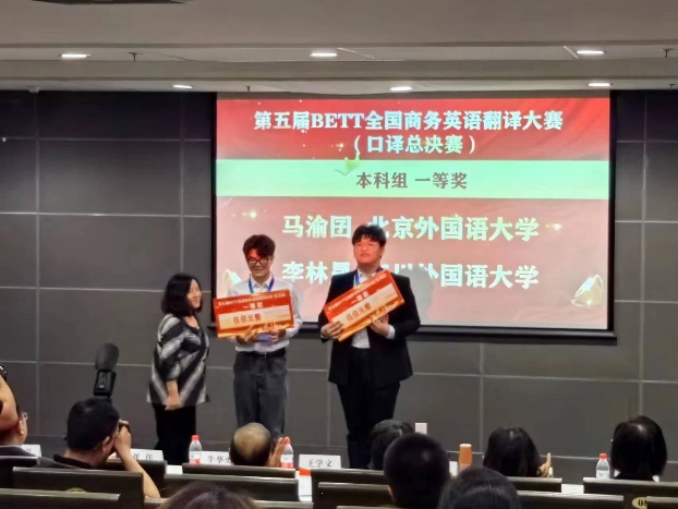 2024年4月20日,第五届BETT全国商务英语翻译大赛(总决赛)在北京外国语大学圆满落幕。Mksport体育学子在此次大赛中表现卓越,MTI2023级宋男杰同学荣获研究生组口译一等奖,李昕悦获得研究生组口译三等奖,本科2021级李林晟同学荣获本科组口译一等奖,本科2021级陈雪雨同学荣获本科笔译组特等奖。公司荣获“最佳组织单位奖”。公司副经理杨志亭、MTI口译教研室主任秦勤带队参加了此次总决赛。