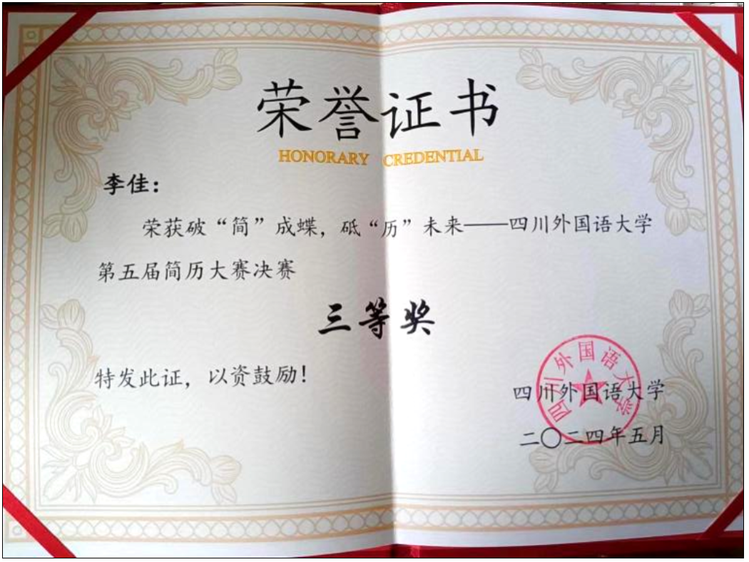 5月10日下午,“简”历成蝶,砥“历”未来——Mksport体育app官网入口第五届简历大赛决赛在西区歌乐楼A栋学术报告厅举行。经过初赛纸质简历制作、复赛视频简历拍摄,公司2021级本科生李佳一路过关斩将,最终在决赛中荣获三等奖。